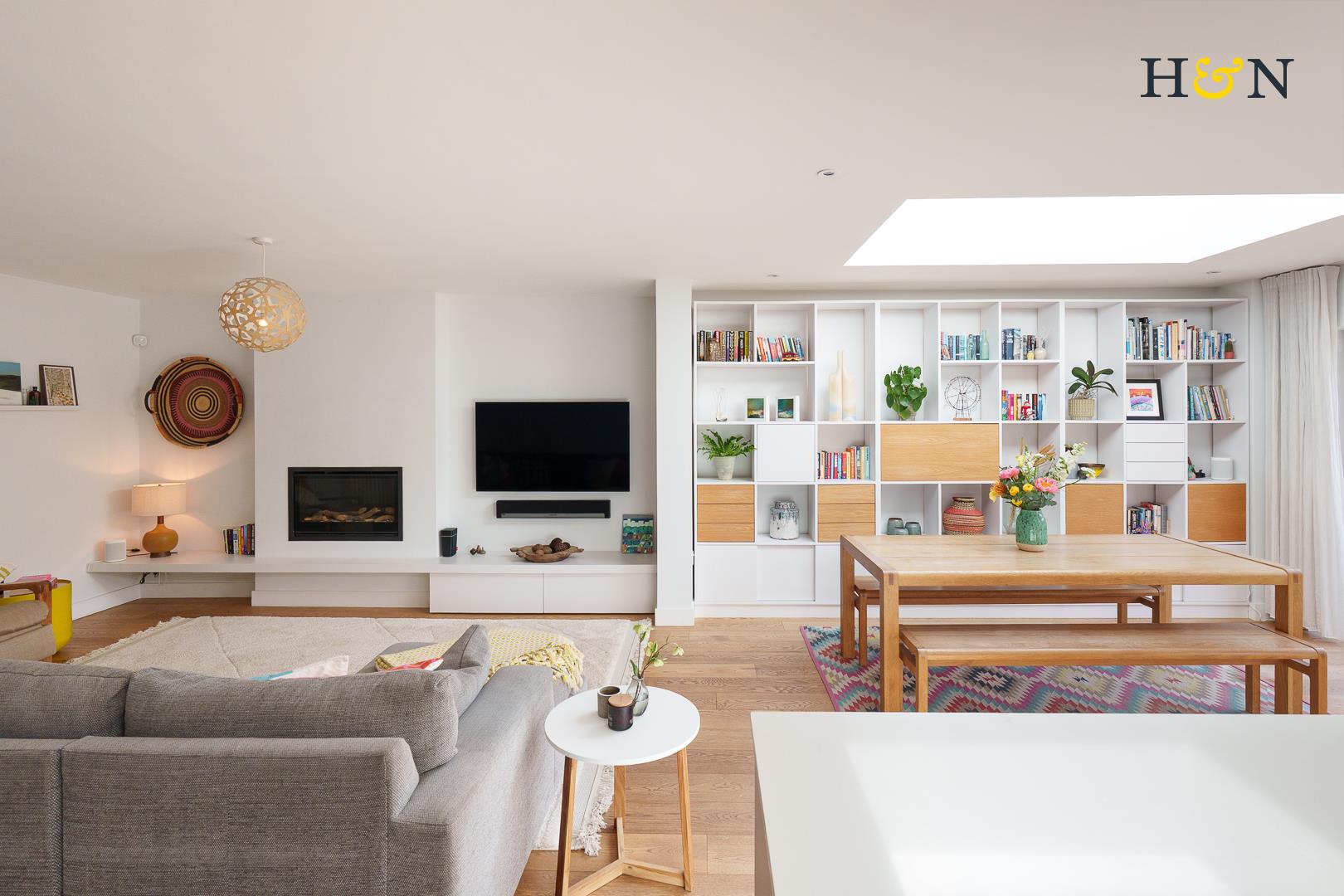 Upon entering, you are greeted by a welcoming entrance hall featuring an original front door and oiled oak flooring. The ground floor is designed as the heart of the home, boasting two reception rooms, including a spacious open-plan family room that seamlessly connects to the landscaped rear garden through elegant Origin bi-fold doors. This remarkable family space is divided into three distinct zones, perfect for both relaxation and entertaining. The bespoke Schüller Biella kitchen is a highlight, equipped with intelligent storage solutions, integrated Neff appliances and has Okite worktops, ensuring both style and functionality. The seating area has a sound proofed wall, TV and audio system, fitted storage and a Bellfires real flame gas fire.
