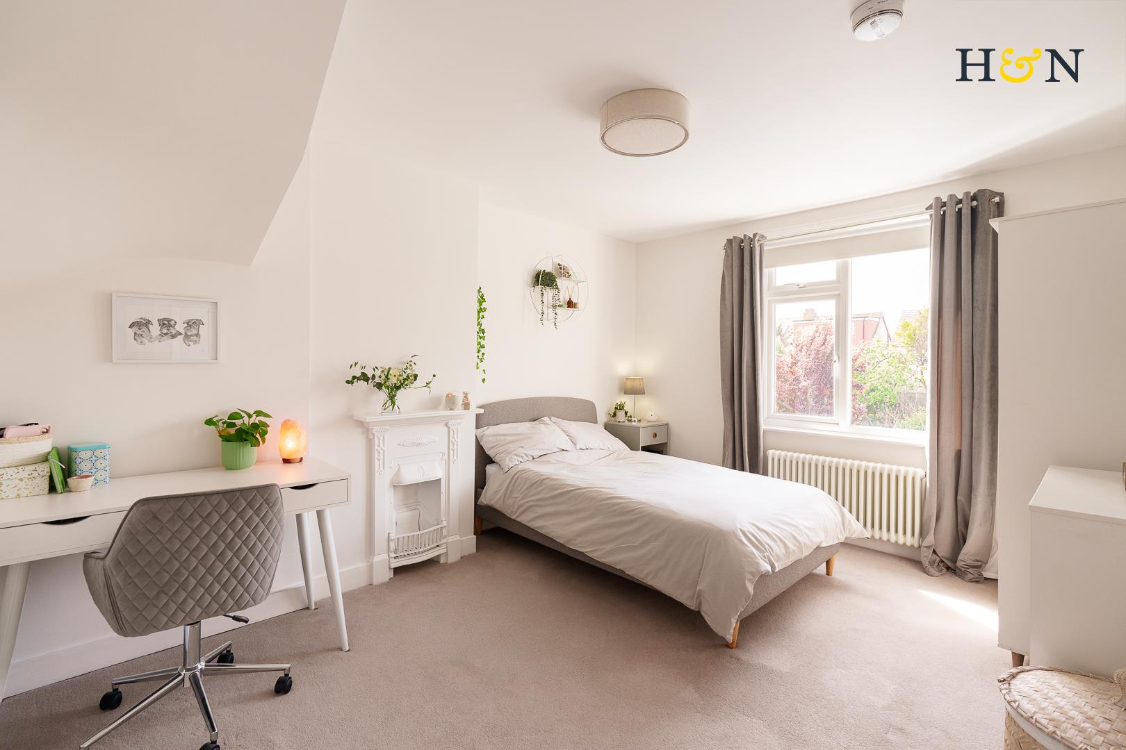 The first floor has three double bedrooms, two of which boast original decorative fireplaces, alongside a separate toilet and a spacious bathroom featuring underfloor heating and a luxurious rainfall shower with push button controls. The top floor is dedicated to a stunning bedroom suite, complete with bespoke wardrobes, an elegant ensuite bathroom and a Juliet balcony offering far-reaching views of the west facing garden.